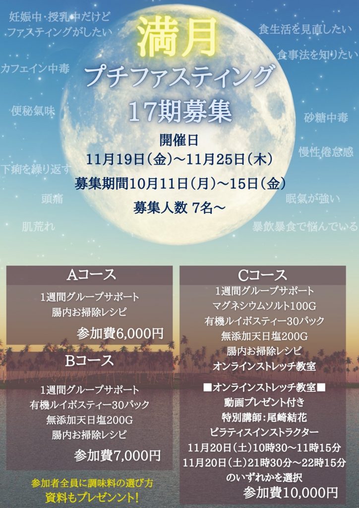 HOME > お知らせ > お知らせ 11月満月ファスティング開催のお知らせ 2021年9月29日 第17期グループ開催 満月ファスティング 募集受付期間 10月11日(月)〜10月15日(金) 開催期間 11月19日〜11月25日 募集予定人数 7名~ お申し込みはこちら 満月ファスティングについてこちらから Twitter Share Pocket Hatena LINE コピーする -お知らせ