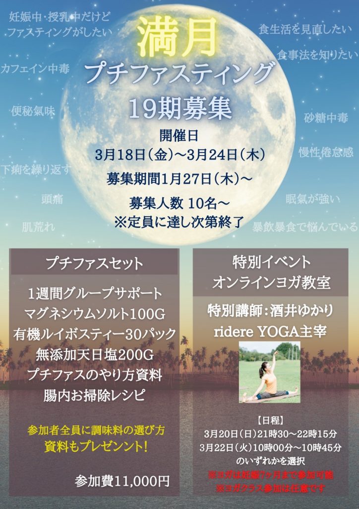 HOME > お知らせ > お知らせ ブログ 2022年3月満月ファスティング開催のお知らせ 2022年1月25日 第19期グループ開催 満月ファスティング 募集受付期間 1月27日(木)〜 開催期間 3月18日(金)〜3月24日(木) 募集予定人数 10名~ (定員に達し次第終了) お申し込みはこちら 満月ファスティングについてこちらから Twitter Share Pocket Hatena LINE コピーする -お知らせ, ブログ